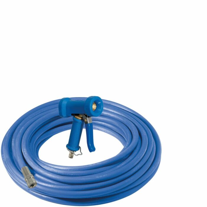 In verschiedenen Längen , DVGW-zugelassener Molkerei-Dampf-Gummischlauch 1/2 Zoll blau , Mit Schlauchverschraubung beidseitig aus Edelstahl , Einerseits mit Schnellkupplungs-Stecker aus Edelstahl , Andererseits mit Schnellkupplung aus Edelstahl , Mit PowerJet-Reinigungsbrause