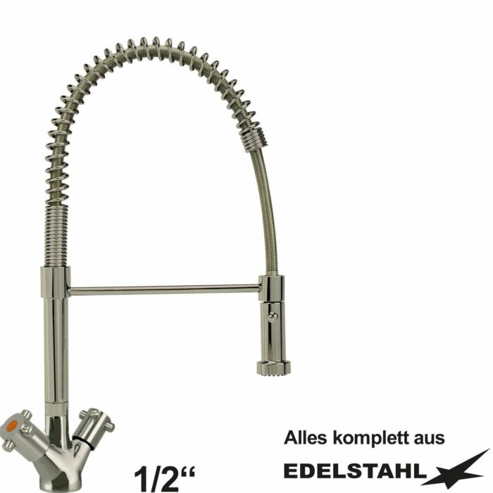 Waschküchenbrause Zweigriffmischer-Einlochbatterie 1/2 Zoll ohne Auslaufventil am Rohr mit RV komplett aus Edelstahl, Gesamhöhe 480 mm
