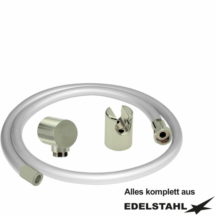 In silbergrauer Ausführung , Für den gewerblichen Einsatz in Bädern und Wellnessbereichen , 3-schichtig gewebeverstärkt mit transparenter Innenseele aus lebensmittelechtem Kunststoff , Für Leitungswasser geeignet , 27 mm / 19 mm x 4 mm individuell in allen Längen lieferbar , KTW ZollA Zoll und DVGW-W270 , Schlauchverschraubung in Edelstahl , Einerseits mit 3/4 Zoll Überwurfmutter, andererseits mit einer von verschiedenen Aufschraubdüsen , Mit Befestigungsschrauben aus Edelstahl und Dübeln