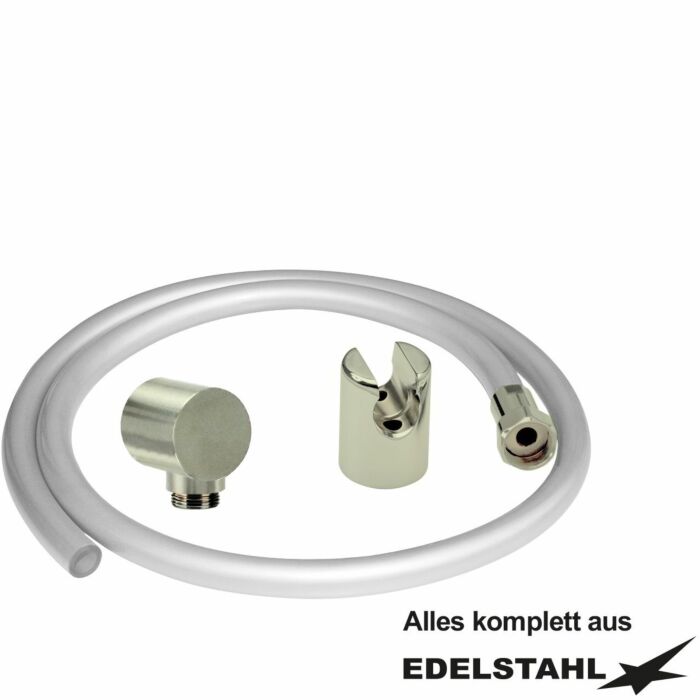 In silbergrauer Ausführung , Für den gewerblichen Einsatz in Bädern und Wellnessbereichen , 3-schichtig gewebeverstärkt mit transparenter Innenseele aus lebensmittelechtem Kunststoff , Für Leitungswasser geeignet , 27 mm / 19 mm x 4 mm individuell in allen Längen lieferbar , KTW ZollA Zoll und DVGW-W270 , Schlauchverschraubung in Edelstahl , Einerseits mit 3/4 Zoll Überwurfmutter, andererseits mit einer Aufweitschraube , Mit Befestigungsschrauben aus Edelstahl und Dübeln