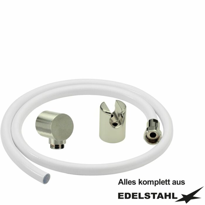 In weißer Ausführung , Für den gewerblichen Einsatz in Bädern und Wellnessbereichen , 3-schichtig gewebeverstärkt mit transparenter Innenseele aus lebensmittelechtem Kunststoff , Für Leitungswasser geeignet , 27 mm / 19 mm x 4 mm individuell in allen Längen lieferbar , KTW ZollA Zoll und DVGW-W270 , Schlauchverschraubung in Edelstahl , Einerseits mit 3/4 Zoll Überwurfmutter, andererseits mit einer Aufweitschraube , Mit Befestigungsschrauben aus Edelstahl und Dübeln