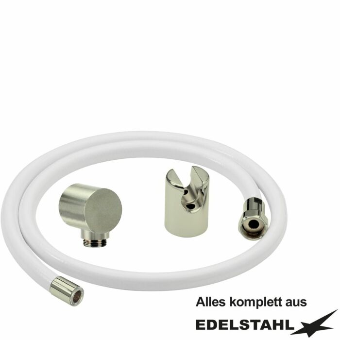 In weißer Ausführung , Für den gewerblichen Einsatz in Bädern und Wellnessbereichen , 3-schichtig gewebeverstärkt mit transparenter Innenseele aus lebensmittelechtem Kunststoff , Für Leitungswasser geeignet , 27 mm / 19 mm x 4 mm individuell in allen Längen lieferbar , KTW ZollA Zoll und DVGW-W270 , Schlauchverschraubung in Edelstahl , Einerseits mit 3/4 Zoll Überwurfmutter, andererseits mit einer von verschiedenen Aufschraubdüsen , Mit Befestigungsschrauben aus Edelstahl und Dübeln