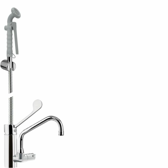Mit Auslaufventil Ausladung 250 mm , Mit wärmeisolierter Geräte-Reinigungsbrause eigensicher gegen Rückfluss und Zirkulation durch DVGW-zugelassene Rückflussverhinderer , Rückschlagfreie Selbstschlussbrause mit stufenlos dosierbarer Strahlstärke 1/2 Zoll x 1/2 Zoll Hochdruck-Edelstahlschlauch L 1200 mm , Wandhalter in Vollmessing-Ausführung verchromt , Hebelmischer-Einlochbatterie 1/2 Zoll , Mit Zuschaltung auf Auslauf am Y-Verteiler , Kartusche Ø 40 mm und langer Bedienhebel , Gewindestutzen L 80 mm, Anschlussdistanz 153 mm