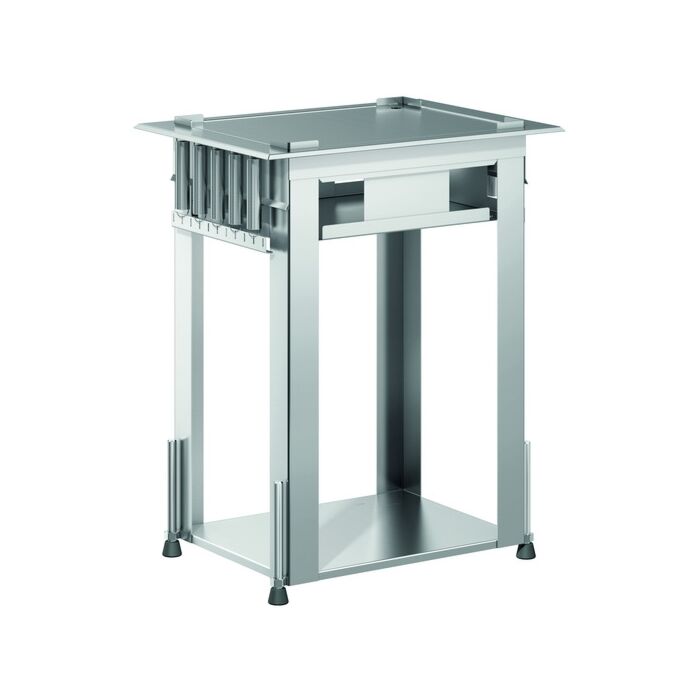 Der Tablettspender ist offen ausgeführt zum Einbau. Der Spender besteht aus einem Rahmengestell, einem Boden und einer Plattform, auf der die Tabletts aufgesetzt werden. Durch Ein- bzw. Aushängen der Zugfedern kann die Federspannung entsprechend dem Stapelgut reguliert werden, um eine gleichbleibende Ausgabehöhe zu gewährleisten.
