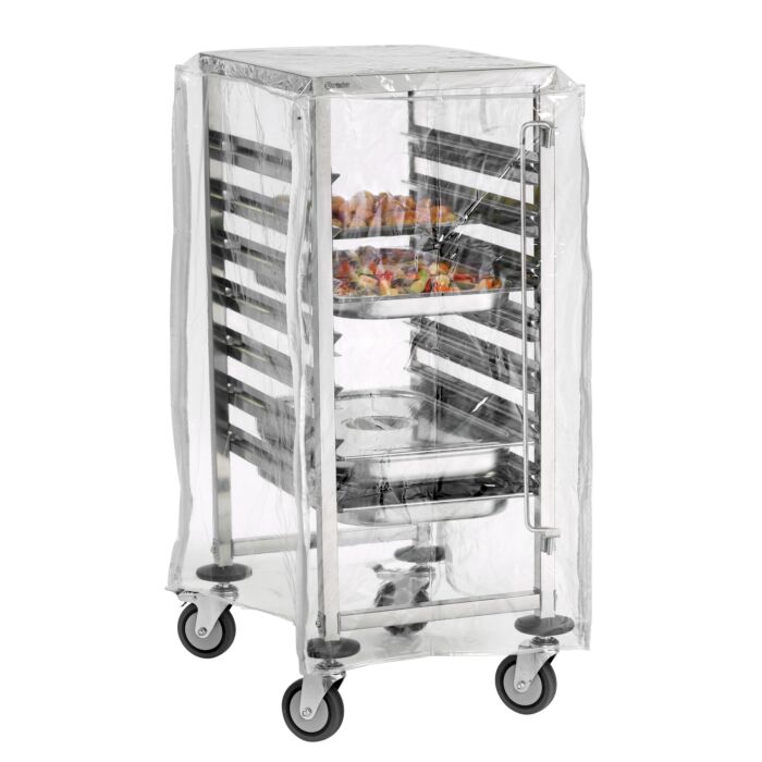 Die zum Gastronormwagen AGN700-1/1 passende transparente Abdeckhaube schützt bei Transport und Lagerung vor Staub und Unreinheiten – sogar in Kühlräumen. Die Reißverschlüsse ermöglichen ein unkompliziertes Bestücken des Wagens auch mit aufgezogener Haube.
