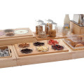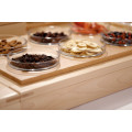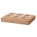 Mit dem modularen Set im schlichten Holzdesign wirkt jedes Buffet ansprechend strukturiert und aufgeräumt. Ob bei Frühstück-, Mittag- oder Abend-Buffets können die 6 Glasschalen beispielsweise mit Joghurt- oder Quarkspeisen, Salate oder Desserts bestückt und auch ganz einfach ausgetauscht oder nachgefüllt werden.