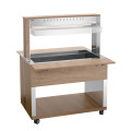 Die mobile Buffetlösung im modernen Holzdesign – Der Buffetwagen mit Hustenschutz und LED-Beleuchtung fasst 3 GN-Behälter 1/1 GN und hält mit dem Wasserbad-Prinzip Speisen schonend und ansprechend am Buffet warm.