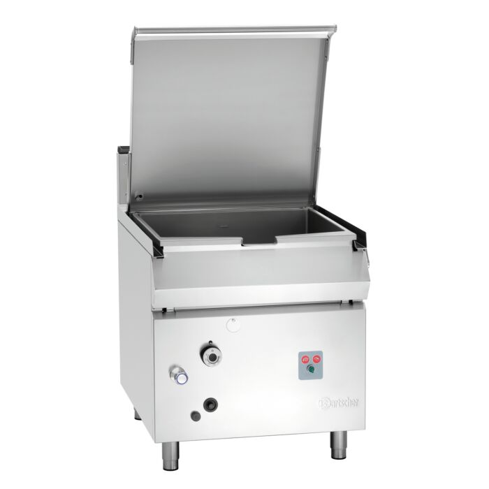 Kippbratpfanne der Serie 900 in bekannter hochwertiger Edelstahl-Ausführung. Der Tiegel ist vollständig aus Edelstahl und fasst bis zu 70 Liter. Das Gas-Modell mit elektromotorischer Kippvorrichtung verfügt über einen Wassereinlaufhahn und ist ausgelegt für einen Kalt- oder Warmwasseranschluss.