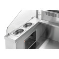 - Ausgestattet mit: Ablagefach unterhalb der Einstellnischen, 4 GN-Behältern 1/9 GN 100 mm tief für Öle, Soßen, Kochbesteck, Integrierter Lüftung mit Labyrinth-Filter