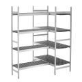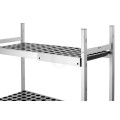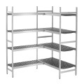 Mit Hilfe der Verbindungsleisten können 360 mm tiefe Regale mit weiteren Regalelementen zur Eckaufstellung verbunden werden. Die Aufstellung im 90 Grad-Winkel ermöglicht eine flexible, organisierte und platzsparende Erweiterung von Lagerflächen im Gastronomiebereich.