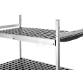 Mit Hilfe der Verbindungsleisten können 560 mm tiefe Regale mit weiteren Regalelementen zur Eckaufstellung verbunden werden. Die Aufstellung im 90 Grad-Winkel ermöglicht eine flexible, organisierte und platzsparende Erweiterung von Lagerflächen im Gastronomiebereich.
