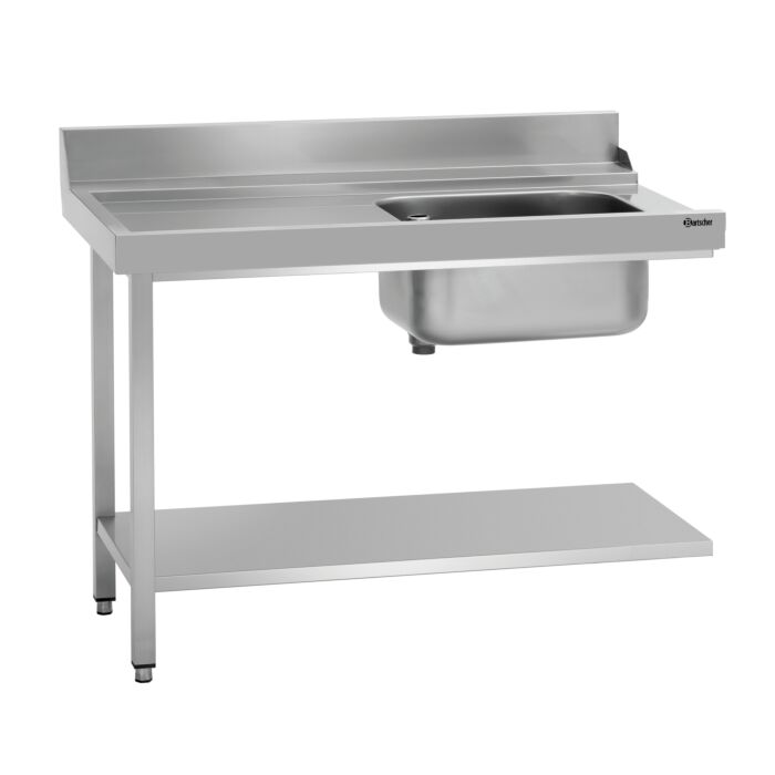 Die 1,2 m breite Vorabräumung mit Spüle ist ausgelegt für den linksseitigen Anbau an die Bartscher Durchschubspülmaschinen DS. Ein Grundboden bietet Abstellfläche für Spülkörbe.
