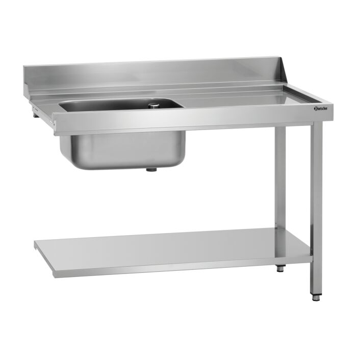 Die 1,2 m breite Vorabräumung mit Spüle ist ausgelegt für den rechtsseitigen Anbau an die Bartscher Durchschubspülmaschinen DS. Ein Grundboden bietet Abstellfläche für Spülkörbe.