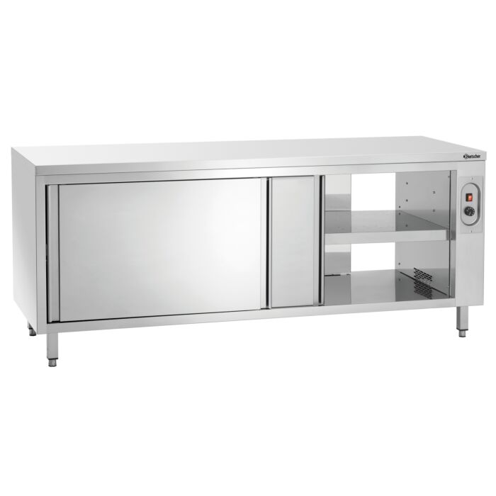 Der Wärmeschrank mit einer Breite von 2 Metern bietet einen stufenlos regulierbaren, beheizten Stauraum mit beidseitiger Bedienung. Mit der robusten Oberfläche aus Edelstahl integriert sich gleichzeitig ein solides Arbeitselement in die Küche.