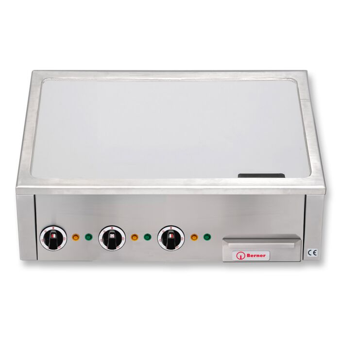Gehäuse und Abdeckung aus mehreren Teilen gefertigt, Rahmen und Platte verschweißt, lediglich die Bodenplatte und Schalterblende ist abnehmbar. In Alu Blöcke eingelassene Kontaktheizkörper sorgen für hohe Wärmespeicherkapazität und gleichmäßige Wärmeverteilung. Gerät mit zwei regelbaren Heizzonen. Dadurch drei unterschiedliche Temperaturen (Temperaturzonen) auf Bratfläche einstellbar. Die einfache Bedienung erfolgt über drei stufenlose Thermostate.
