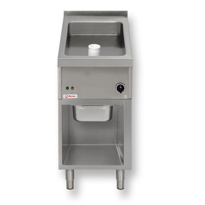 Gehäuse, Unterbau und Abdeckung aus mehreren Teilen gefertigt. Schalter-, Revisionsblende, hintere Blende und oberer Boden im Unterbau abnehmbar. Platte Hartplattiert Edelstahl, R12, mit Spezialschliff für eine gute Antihaftwirkung. Ecken gerundet, vorne mit Ablaufloch rund (Ø 55 mm) mit Teflonstopfen und Fettschublade im Unterbau. In Alu Blöcke eingelassene Kontaktheizkörper sorgen für hohe Wärmespeicherkapazität und gleichmäßige Wärmeverteilung. Die einfache Bedienung erfolgt über ein stufenloses Thermostat mit Betriebs- und Heizungsanzeige. Gerät mit einer regelbaren Heizzone.