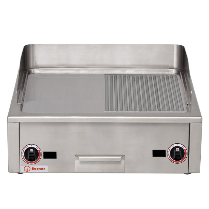 Platte Edelstahl plattiert Stärke 12 mm, vorn mit Abwurfschacht in Fettschublade. Bedienung der Heizzone über einen stufenlosen Regler. Eine 4-stellige digitale Anzeige zeigt die IST/SOLL Temperatr an.
