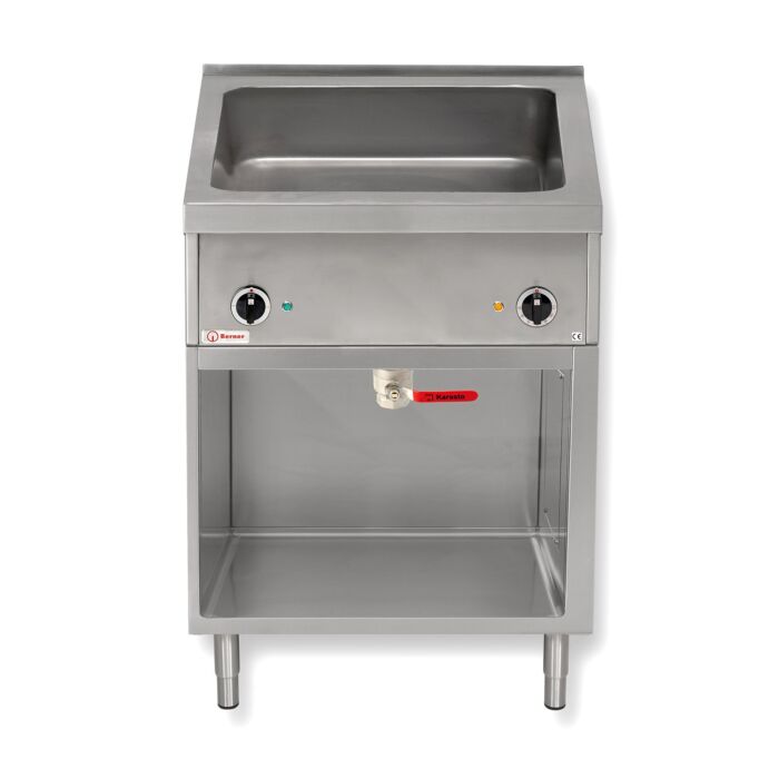Standgerät mit flächenbündig eingesetzten Becken. Unterbau vorne offen. Hinten 20 mm aufgekantet. Sockelbaufähig (auch Vollsockel) oder auf Füßen. Gehäuse und Abdeckung aus mehreren Teilen gefertigt. Schalter-, Revisionsblende, hintere Blende und oberer Boden im Unterbau abnehmbar. Rundungen und glatte Oberflächen ermöglichen eine optimale Reinigung. Die einfache Bedienung erfolgt über ein stufenloses Thermostat und einen Hauptschalter mit Betriebslampe. Wasserablass mit Kugelhahn ¾“ nach unten in Unterbau. Mit Betriebs- und Heizanzeigelampe in Blende.