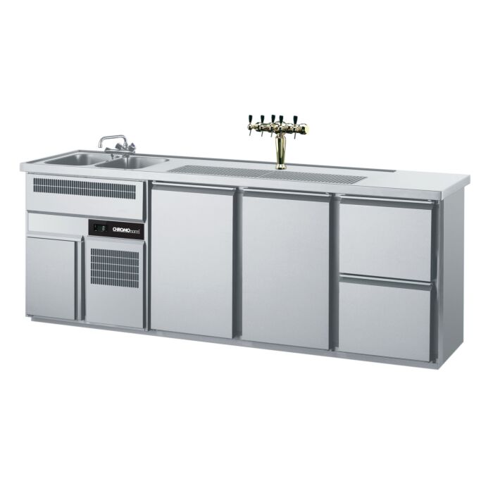 Ausführung Chromonorm Schanktresen/Biertresen mit 2 Becken wahlweise rechts o. links, 2 Türen, 2 Schubladen: