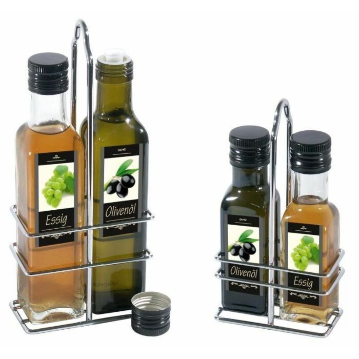 - mit innenliegendem Ausgießer aus Kunststoff und Schraubverschluss aus Metall für die Lagerung der Flaschen