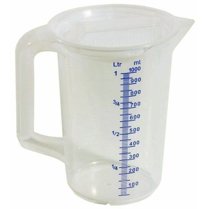 - Volumen: 1 l (Messskala in 10 ml Schritten, Ziffern alle 100 ml)