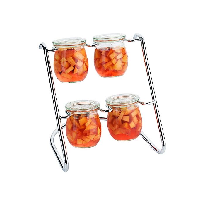 - aus verchromtem Stahldraht, mit 4 bzw. 8 bauchigen Weckgläsern 220 ml in Tulpenform, auch für zylindrische Sturzgläser von Weck® geeignet.