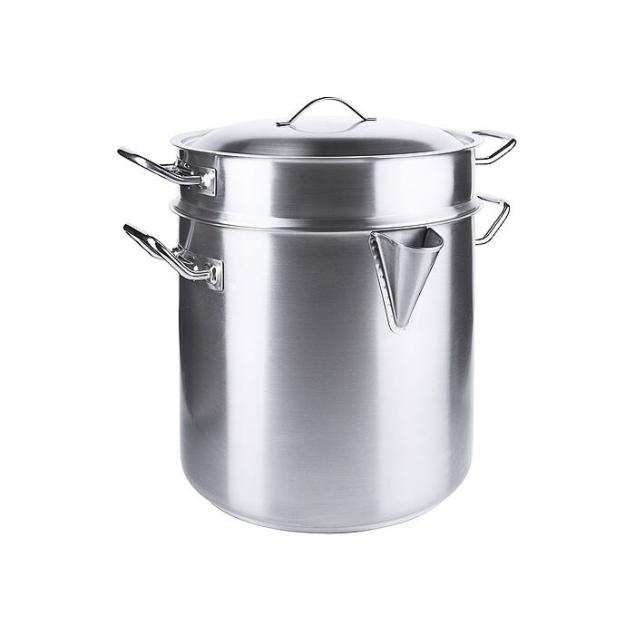 - aus Edelstahl 18/10, matt poliert, mit Sandwichboden und Ausgussschnaupe, induktionsgeeignet, komplett mit Einsatz 1405 und Deckel 2161