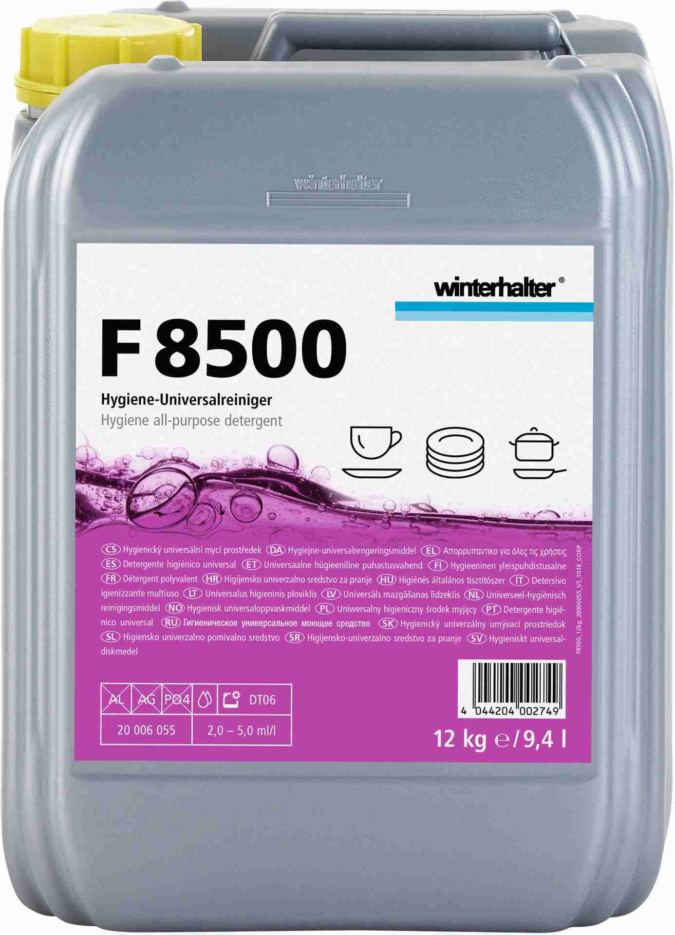 Der F 8500 ist ein flüssiger, hochalkalischer, aktivchlorhaltiger Universalreiniger für professionelle Fronttür-, Korbdurchschub-, Korbtransport- und Bandtransportspülmaschinen in Restaurants, Hotels und Küchen der Gemeinschaftsverpflegung. Dank seiner Bleichkomponente entfernt der F 8500 besonders wirkungsvoll angetrocknete Speisereste, sowie Kaffee- bzw. Teerückstände und andere Farbstoffe. Der Reiniger kann zum Spülen von Geschirr, Gläsern, Besteck sowie Gegenständen aus Kunststoff und Edelstahl eingesetzt werden. Darüber hinaus besitzt F 8500 eine sehr gute Fett- und Eiweißlösekraft. Für Silber, Aluminium (auch eloxiert) und Leichtmetalllegierung ist der F8500 nicht geeignet.