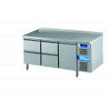3-türiger Kühltisch für GN 1/1 mit eingeschäumtem Verdampfersystem, Umluftkühlung, elektronischer Regelung, Hygieneausführung. Komplett aus CNS (1.4301), auch Boden und Rückwand. Die Lieferung erfolgt ohne Tischplatte!