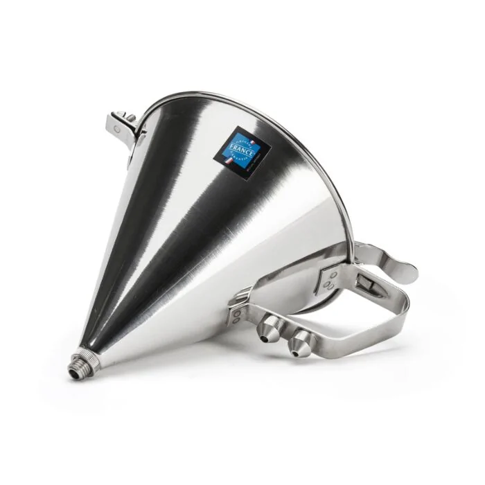 Automatischer Trichter KWIK PRO, vollständig aus Edelstahl, zum Befüllen, Eingießen und Dekorieren. Ideal für flüssige und halbflüssige Zubereitungen wie Saucen, heißes Gelee, heißer Karamel, Quichebelagsmasse usw. Einfach zu benutzen: Ausgießen der Zubereitung durch Druck des Daumens auf den Hebel. Der Hebel hat ein ausgeklügeltes Design für eine ergonomische Daumenposition. 3 Dosierdurchmesser (ø 8 mm, und zwei mitgelieferte Düsen ø 4 und 6 mm) Steuerung der Dosierung mit Hilfe des Daumens und des Hebels. Edelstahltrichter: Inhalt 1,5 l und 1,9 l je nach Modell. Innenliegender Mechanismus, vollständig demontierbar mit einer Flügelmutter. ein Gestell aus Edelstahldraht ist erhältlich: Mit Silikon überzogene rutschfeste Füße; hohe Stabilität. Auf dem Gestell kann man eine Zubereitung zeitweilig beiseitestellen, und die Befüllung wird vereinfacht. Für Bain-Marie geeignet. Pflege: spülmaschinenfest.