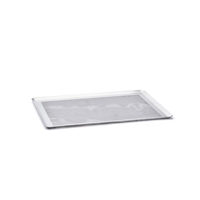 Rechteckiges, mikroperforiertes Backblech mit schrägen Kanten aus unbeschichtetem Aluminium. Ideal zum Backen von kleinen Backwaren oder Speisen, für das Backen von Pasteten, Blätterteig, Tartes, Quiches, Viennoiseries. Der beste Verbündete Ihrer Silikonbackmatten. Auch mit Backfolie und mit Silikonformen kombinierbar. Ideal einsetzbar in einem Konvektionsofen. Optimale Mikroperforation Ø 3mm: Hervorragende Heiß- und Kaltluftzirkulation, für homogenes Backen. Perfekte Verteilung und Weitergabe der Hitze. Dickes, leichtes, widerstandsfähiges Backblech, formstabil. Nicht für flüssige oder halbflüssige Zubereitungen verwenden. Nicht im leeren Zustand erhitzen. Nicht überhitzen. Pflege: spülmaschinenfest.