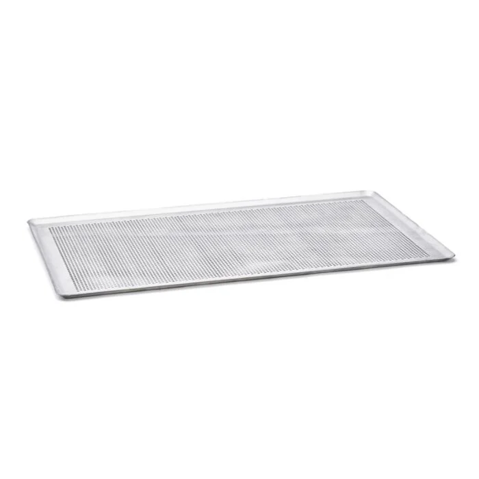 Rechteckiges, mikroperforiertes Backblech mit schrägen Kanten aus unbeschichtetem Aluminium. Ideal zum Backen von kleinen Backwaren oder Speisen, für das Backen von Pasteten, Blätterteig, Tartes, Quiches, Viennoiseries. Der beste Verbündete Ihrer Silikonbackmatten. Auch mit Backfolie und mit Silikonformen kombinierbar. Ideal einsetzbar in einem Konvektionsofen. Optimale Mikroperforation Ø 3mm: Hervorragende Heiß- und Kaltluftzirkulation, für homogenes Backen. Perfekte Verteilung und Weitergabe der Hitze. Dickes, leichtes, widerstandsfähiges Backblech, formstabil. Nicht für flüssige oder halbflüssige Zubereitungen verwenden. Nicht im leeren Zustand erhitzen. Nicht überhitzen. Pflege: spülmaschinenfest.