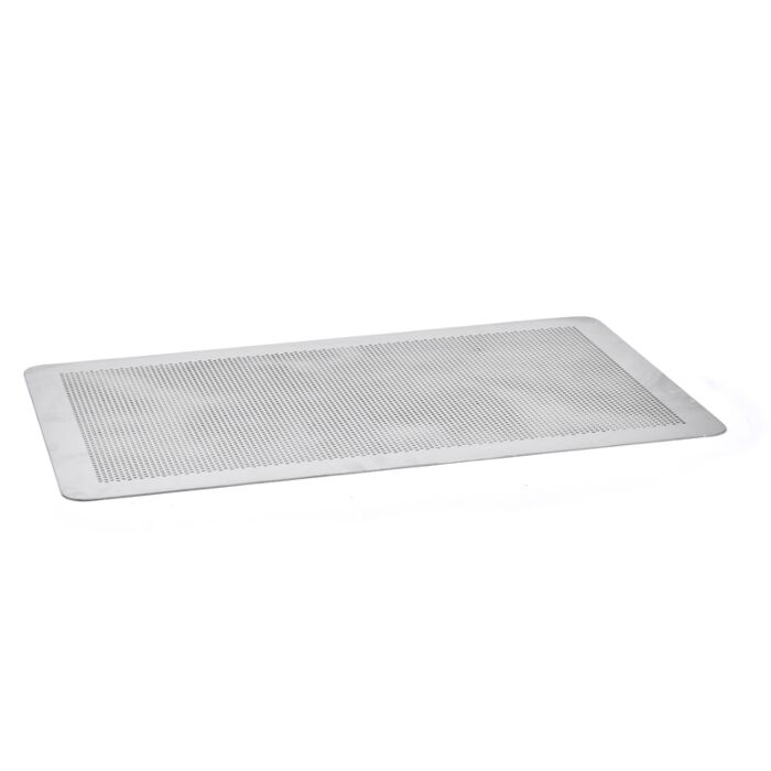 Dickes Aluminiumbackblech 1,5 mm. Keine Ränder = optimale Raumausnutzung. Damit können Backmatten und Backfolien vollständig flach ausgebreitet werden. Perforierung ø 3 mm für homogenes Backen und knusprige Böden
