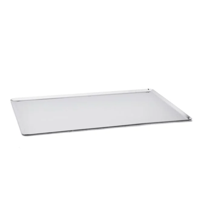 Rechteckiges Backblech aus Edelstahl mit schrägen Kanten, zum Lagern von Speisen, für den Transport und das Arbeiten mit Kälte (Kühlen, Einfrieren, Tiefkühlen). Ideal für die elegante Präsentation von Speisen und Backwaren, dank der hochwertigen Spiegelpolitur. Auch für bestimmte unempfindliche Garvorgänge geeignet. Kombinierbar mit einer Silikonbackmatte oder mit Backpapier für das Kaltformen (leichteres Ausformen) und Backen. Geeignet als Unterlage für Formen, Ringe und Metallrahmen von de Buyer. Voll beständig gegenüber sehr niedrigen Temperaturen und Feuchtigkeit. Robust: beständiges und formstabiles Backblech. Hygienisch: leicht sauber zu halten. Pflege: spülmaschinenfest. Gelegentlich mit Spezial-Polierpaste für Edelstahl polieren, um den vollen ursprünglichen Glanz zurückzugewinnen.