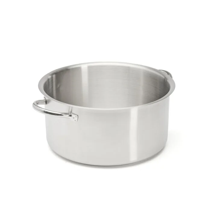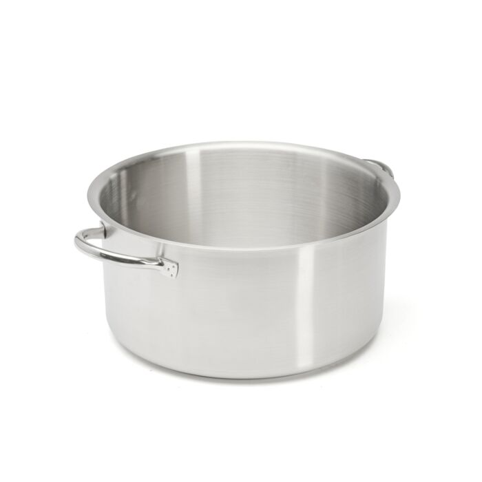 Bratentopf, ganz aus Edelstahl, zum Schmoren von Fleischstücken. Kochgeschirr PRIM'APPETY aus Edelstahl AISI 304 mit Gießrand und Sandwichboden, ermöglicht die homogene Ausbreitung der Hitze auf dem ganzen Boden. Für Induktion geeignet. Robuste und langlebige Profiqualität. Rohrgriffe aus an mehreren Punkten verschweißtem Edelstahl = einfaches und angenehmes Festhalten. Innenflächen glatt. Seidenmatte, polierte und gebürstete Oberfläche. Spülmaschinenfest. Gelegentlich mit Spezial-Polierpaste für Edelstahl polieren, um den ursprünglichen Glanz zurückzugewinnen. Für alle Herdarten, auch Induktion.