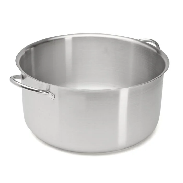 Bratentopf, ganz aus Edelstahl, zum Schmoren von Fleischstücken. Kochgeschirr PRIM'APPETY aus Edelstahl AISI 304 mit Gießrand und Sandwichboden, ermöglicht die homogene Ausbreitung der Hitze auf dem ganzen Boden. Für Induktion geeignet. Robuste und langlebige Profiqualität. Rohrgriffe aus an mehreren Punkten verschweißtem Edelstahl = einfaches und angenehmes Festhalten. Innenflächen glatt. Seidenmatte, polierte und gebürstete Oberfläche. Spülmaschinenfest. Gelegentlich mit Spezial-Polierpaste für Edelstahl polieren, um den ursprünglichen Glanz zurückzugewinnen. Für alle Herdarten, auch Induktion.