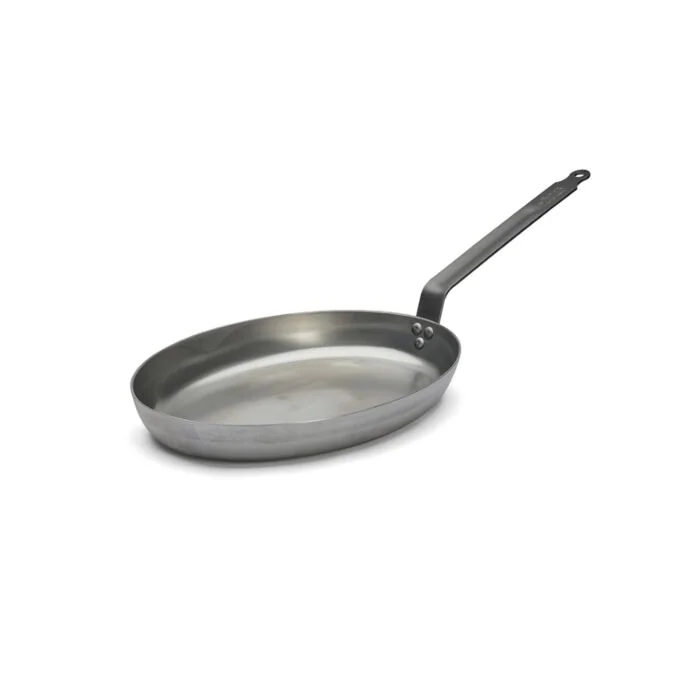 Ovale Fischpfanne, ideal zum Garen von ganzen Fischen. Blech aus dickem Weißstahl: formstabil, rascher Temperaturanstieg, gleichmäßige Hitzeverteilung. Erreicht hohe Temperaturen: Ermöglicht die Maillard-Reaktion; hervorragende Karamelisierung. Natürlicher Haftschutz: allmähliches Einbrennen der Pfanne, je mehr sie verwendet wird, umso weniger haftet sie. Unzertrennlicher vernieteter Stahlbandstiel. Krümmung à la française: leichte Handhabung und ergonomisches Festhalten. Tipp: mit wenig Fett vorheizen. Einbrennen vor der ersten Verwendung. Pflege: Mit Wasser ablöschen, mit warmem Wasser abspülen, abtrocknen und leicht einölen. An einem trockenen Ort aufbewahren. Keine Reiniger verwenden und nicht im Geschirrspüler waschen. Für alle Herdarten, auch Induktion.