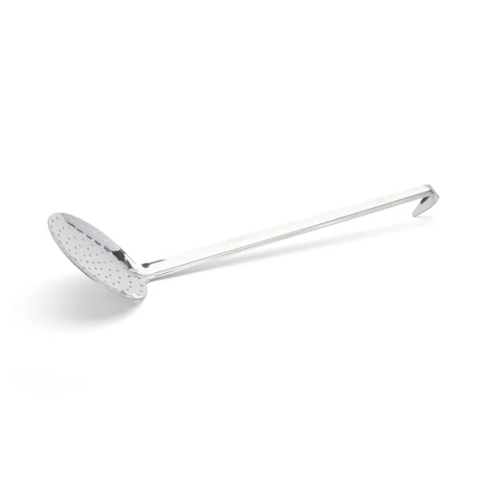 Zum Abschöpfen und Abtropfen lassen von Lebensmitteln. Profigerät aus robustem Edelstahl. Ergonomisch geformter Grif. Hindert das Utensil am Rotieren, auch bei fettigen oder feuchten Händen. Einfache, mühelose Handhabung. Ideale Neigung des Griffs. Für alle Behälter einschließlich tiefe Kochtöpfe. Am Ende des Utensils befindet sich ein stabiler Haken. Geeignet zum Aufhängen an runden oder quadratischen, dünnen oder dicken Vorrichtungen. Perforierung des Schaumlöffels: optimimaler Durchmesser und Abstand, verteilt über die gesamte Fläche. Glatte Oberfläche und Entgratet. Pflege: spülmaschinenfest.