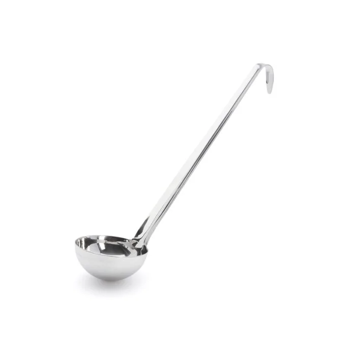 Profigerät aus robustem Edelstahl. Ergonomisch geformter Griff. Hindert das Utensil am Rotieren, auch bei fettigen oder feuchten Händen. Gute, mühelose Handhabung. Ideale Neigung des Griffs. Für alle Behälter einschließlich tiefer Kochtöpfe. Am Ende des Geräts befindet sich ein stabiler Haken. Geeignet zum Aufhängen an runden oder quadratischen, dünnen oder dicken Vorrichtungen. Gleichmäßige Rundungder gesamte Kuppel. Unverzichtbar für effizientes Ausgießen. Gepflegte Oberfläche und Entgratet. Pflege: spülmaschinenfest.