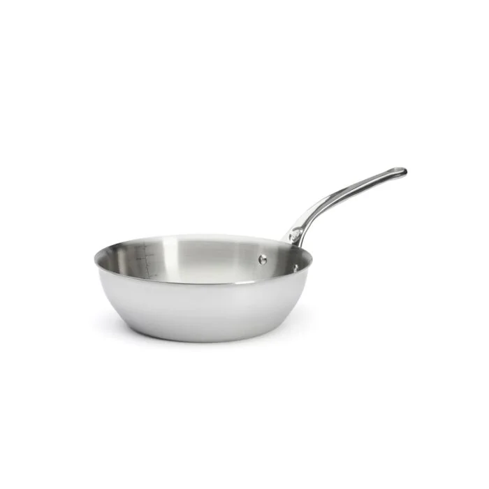 Konische Sauteuse / Schmorpfanne mit weitem Gießrand. Die Form ermöglicht ein stärkeres Verdampfen und ist somit auch ideal zum Reduzieren von Saucen. Formbeständiges Kochgeschirr der AFFINITY-Serie aus mehrschichtigem Material: äußere Lagen aus Edelstahl, innere aus Aluminiumlegierungen. Ultrareaktives Material: sehr rascher Temperaturanstieg, aber auch eine prompte Reaktion ohne Nachgaren, wenn das Kochgeschirr vom Herd genommen wird. Eine sehr gute Kontrolle des Garprozesses. Gleichmäßige Verteilung der Hitze auch über die Wände, perfekter Wärmekreislauf und homogene Erhitzung. vernieteter Stiel aus Edelstahlguss: ergonomisch, liegt bequem in der Hand; schlichte Eleganz. Der Stiel behält eine niedrige Temperatur. Hochwertige Produktserie in modernem, elegantem Design. Hochwertige Spiegelpolitur. Hygienisch: spülmaschinenfest. Gelegentlich mit Polierpaste polieren, um den ursprünglichen Glanz zurückzugewinnen. Für alle Herdarten, auch Induktion.