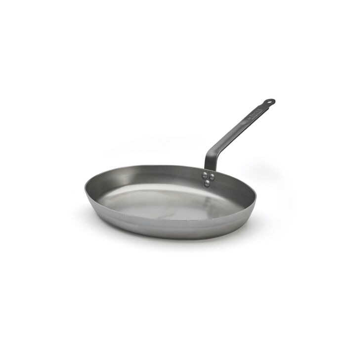 Ovale Spezial-Fischpfanne für den Salamandre-Grill, ideal zum Garen von ganzen Fischen, zum Warmhalten oder Grillen unter einem Salamandre-Grill. Blech aus dickem Weißstahl: rascher Temperaturanstieg, gleichmäßige Hitzeverteilung. Erreicht hohe Temperaturen: Ermöglicht die Maillard-Reaktion; hervorragende Karamelisierung. Natürlicher Haftschutz: allmähliches Einbrennen der Pfanne, je mehr sie verwendet wird, umso weniger haftet sie. Vernieteter Stahlgriff: Unzertrennlich. Krümmung à la française: leichte Handhabung und ergonomisches Festhalten. Tipp: mit wenig Fett vorheizen. Einbrennen vor der ersten Verwendung. Pflege: Mit Wasser ablöschen, mit warmem Wasser abspülen, abtrocknen und leicht einölen. An einem trockenen Ort aufbewahren. Keine Reiniger verwenden und nicht im Geschirrspüler waschen. Für alle Herdarten, auch Induktion.