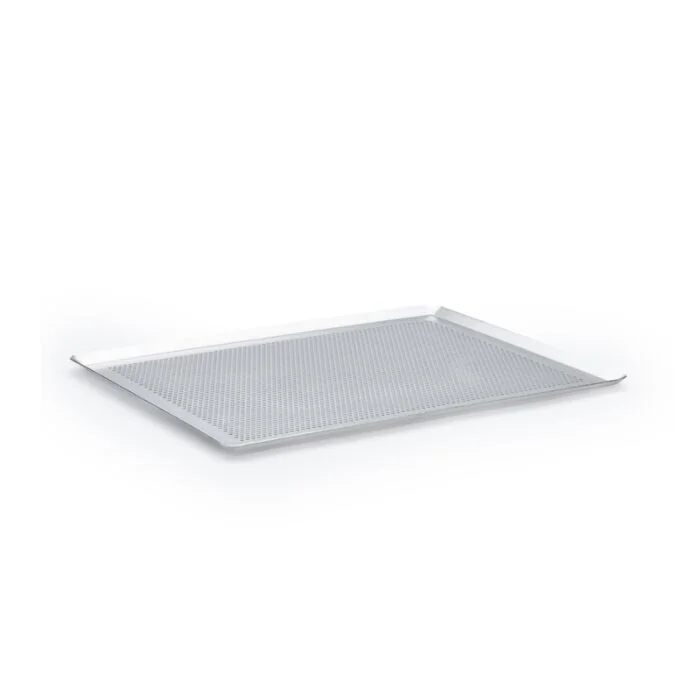 Perforiertes rechteckiges Backblech mit schrägen Kanten aus Edelstahl. Ideal zum Backen von Minigebäck oder kleinen Speisen, zum Backen von (Blech-) Kuchen, Galettes, Pizza, Plätzchen uvm. Der beste Verbündete für Ihre Silikonmatte. Auch für Backbleche und Silikonformen geeignet. Ideal für den Einsatz in einem Konvektionsofen. Optimale Perforation mit 3 mm Durchmesser: hervorragende Heiß- oder Kaltluftzirkulation. Perfekte Wärmeverteilung und -übertragung. Dickes, leichtes und stabiles Blech, unverformbar. Nicht mit flüssigen oder halbflüssigen Zubereitungen verwenden. Nicht leer erhitzen oder überhitzen.