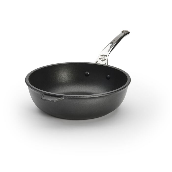 De Buyer bewahrt die Tradition der berühmten "à la française" gekrümmten Stiele aus Stahlguss, modernisiert die ästhetische Gestaltung und optimiert die Ergonomie. Gestattet eine präzise Handhabung und bequeme Benutzung. Der dicke Aluminiumguss sorgt für gleichmäßiges, kontrolliertes Kochen und gestattet insbesondere auch das Köcheln von Gerichten.