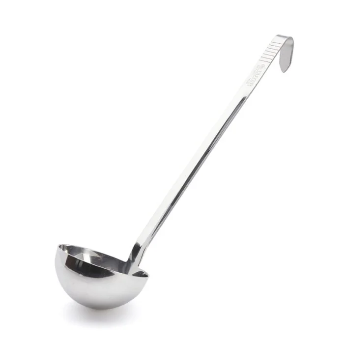 Profigerät aus robustem Edelstahl. Breiter Griff, Dicke 2,5 mm, sehr steif. Ergonomisch geformter Griff. Ideale Neigung des Griffs. Am Ende der Utensilien befindet sich ein stabiler Haken. Geeignet zum Aufhängen an runden oder quadratischen, dünnen oder dicken Vorrichtungen. Auf dem Griff eingravierte Literzahl. Pflege: spülmaschinenfest.