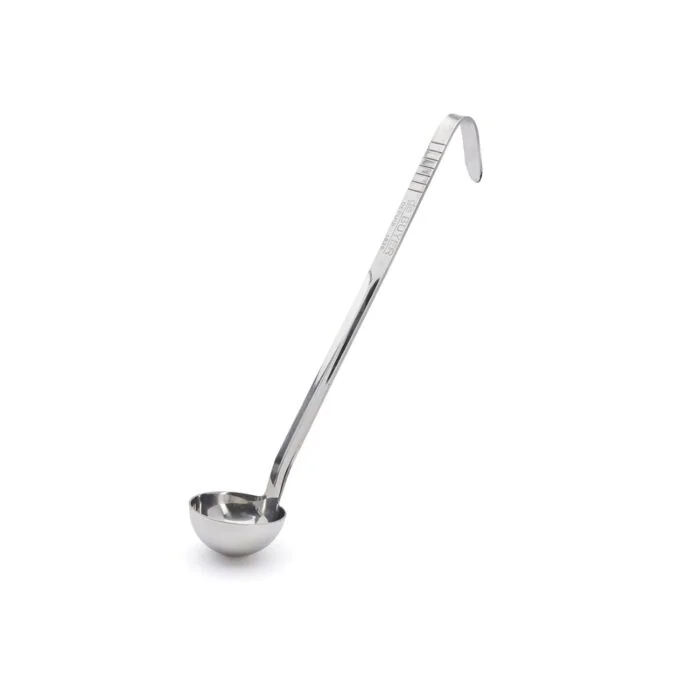 Profigerät aus robustem Edelstahl. Breiter Griff, Dicke 2,5 mm, sehr steif. Ergonomisch geformter Griff. Ideale Neigung des Griffs. Am Ende der Utensilien befindet sich ein stabiler Haken. Geeignet zum Aufhängen an runden oder quadratischen, dünnen oder dicken Vorrichtungen. Auf dem Griff eingravierte Literzahl. Pflege: spülmaschinenfest.