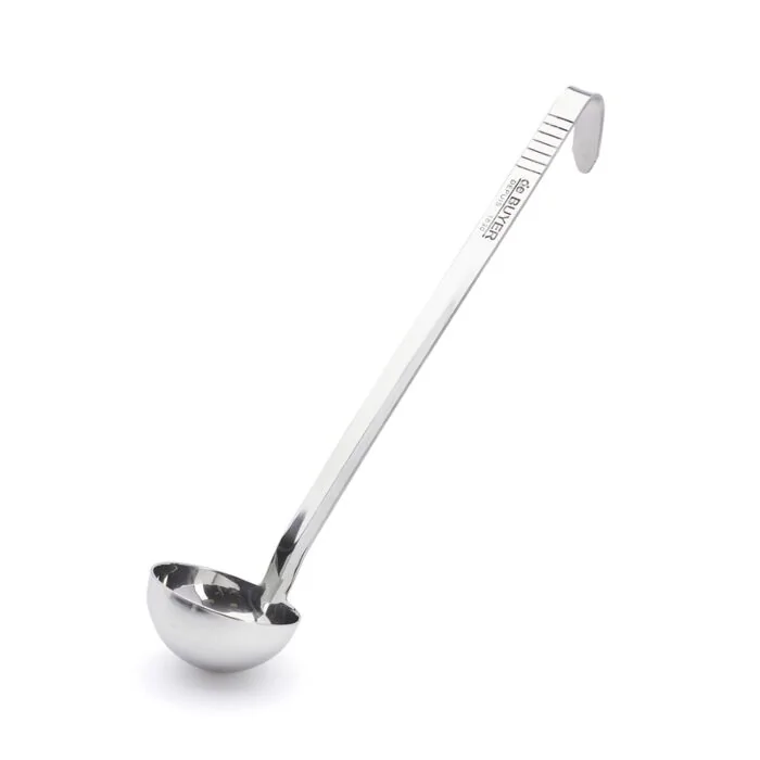 Profigerät aus robustem Edelstahl. Breiter Griff, Dicke 2,5 mm, sehr steif. Ergonomisch geformter Griff. Ideale Neigung des Griffs. Am Ende der Utensilien befindet sich ein stabiler Haken. Geeignet zum Aufhängen an runden oder quadratischen, dünnen oder dicken Vorrichtungen. Auf dem Griff eingravierte Literzahl. Pflege: spülmaschinenfest.
