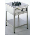 Rahmenkonstruktion aus Vierkantrohr 80 x 80 mm. Der Unterbau ist offen mit Grundboden und die Gestelltrennung ist serienmäßig. Einteilige Herdabdeckung mit Brennermulden, darunter befinden sich die Fettauffangschalen. Spezialwarzenbrenner mit 14 kw. Ohne Werkzeug herausnehmbar.