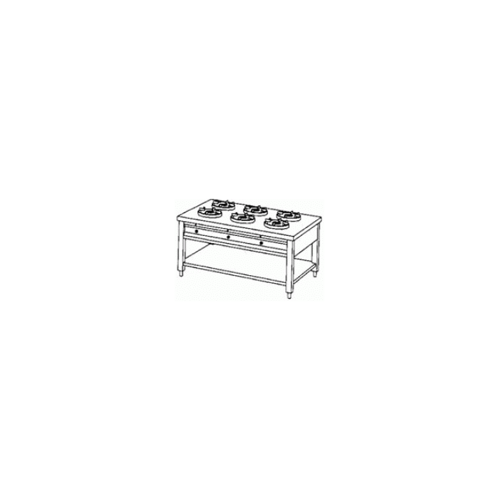 Rahmenkonstruktion aus Vierkantrohr 80 x 80 mm. Der Unterbau ist offen mit Grundboden und die Gestelltrennung ist serienmäßig. Einteilige Herdabdeckung mit Brennermulden, darunter befinden sich die Fettauffangschalen. Spezialwarzenbrenner mit 14 kW. Ohne Werkzeug herausnehmbar.