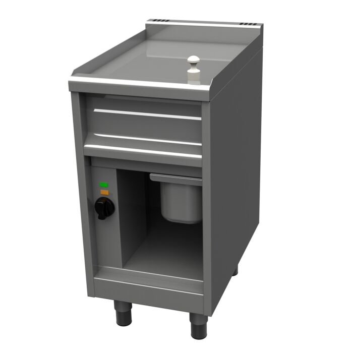 - Fettablauf Ø 60 mm vorne rechts in einen Fettauffangbehälter GN 1/6 - 150 mm