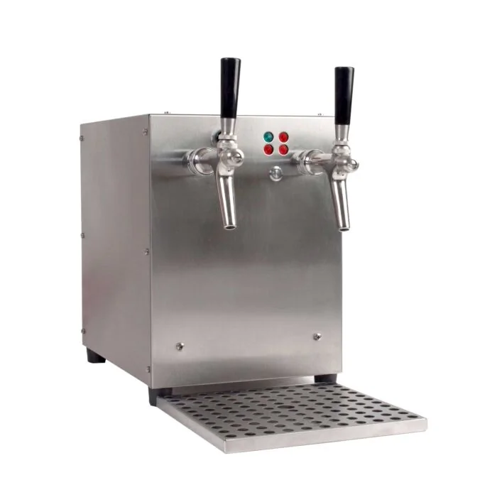 Getränkedurchlauferhitzer 2-leitig in Edelstahl mit integriertem Luftkompressor, verwendbar zum Anschluss an externe Flojet-Pumpen oder zum Zapfen aus KEG-Fässern,Leistungsaufnahme: 9 kW/h mit Edelstahl-Zapfhähnen